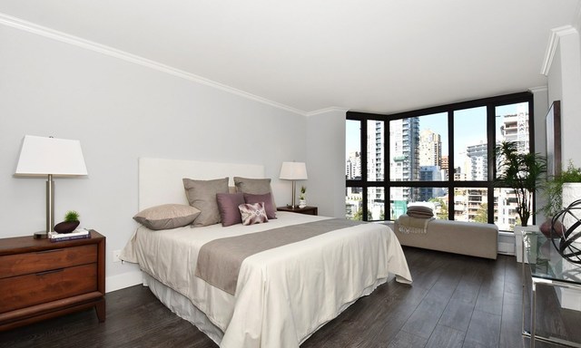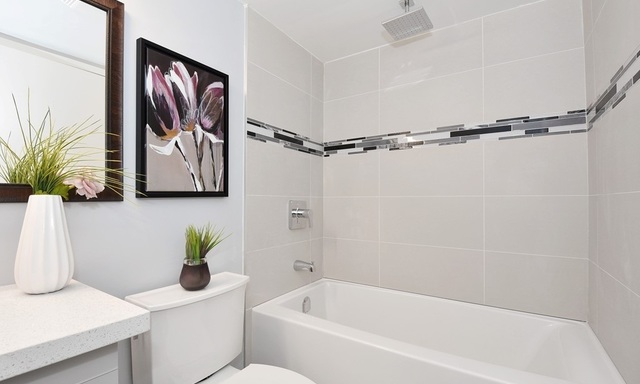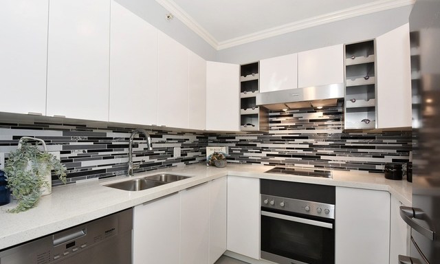 The kitchen and two bathrooms are fitted to have new and better fixtures that help reduce water consumption. Staying within the calm and relaxing colour scheme, these rooms use tiles in cool grey tones and cabinets with white flat panel doors. Quartz is used for all countertop surfaces to ensure less maintenance over the years and to give a sense of efficient luxury to the unit.