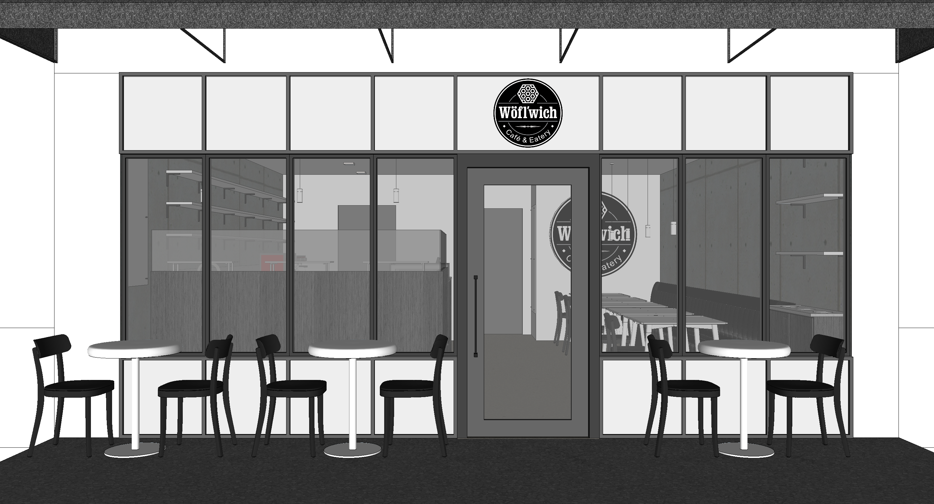 Drawn from different design languages, several schemes were developed to achieve the most suitable aesthetics and efficient workflow. This exploration concluded in combining craftsman style and colonial architecture as the primary visual identity for the cafe, as they harken to the waffles' historical background without being literal in its interpretation. Through this combination, the cafe exudes an atmosphere of calm luxury manifested by a monochromatic scheme, tall and inviting windows, and careful application of textures and patterns.