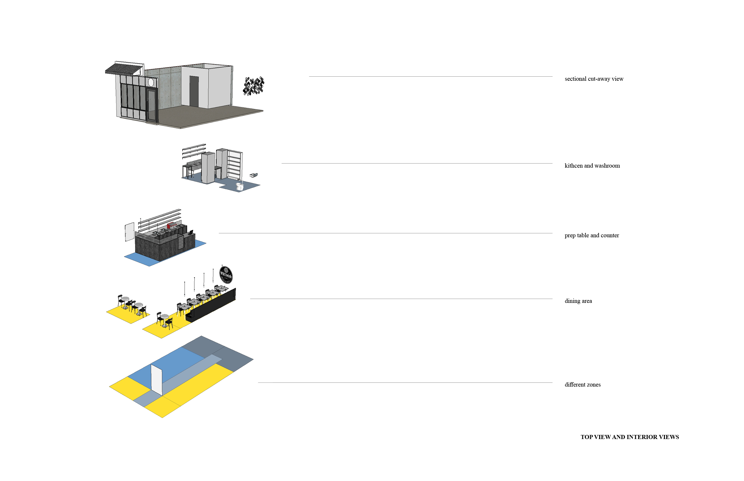 Detailed analyses and scenario building exercises were conducted to assess the best way to organize the appliances, equipment, and ingredients for creating both savoury and sweet waffles. Spaces for food display are strategically located along the counter to provide customers with a visual guide to the different ways the waffles are served. The counter and work station are basically the focal point of the whole layout, and everything else flows around it. Additionally, the work station needs to be flexible and adaptable to different locations, which could influence the maximum number of customers the cafe can serve.